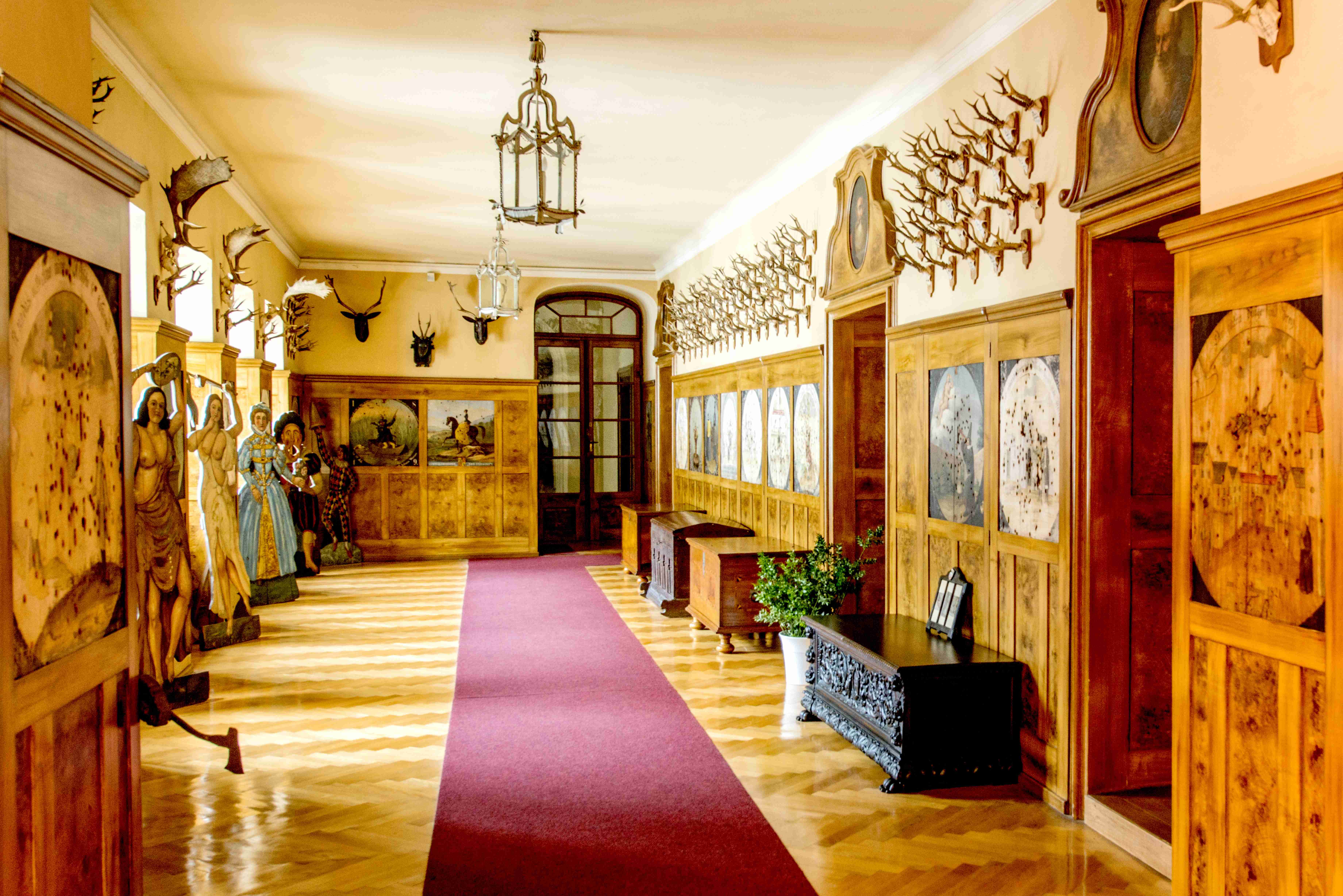 Treppenhalle im Nordflügel, Appartements des letzten adeligen Eigentümers, Gästeappartements, kleine und große Schießscheibenausstellung.